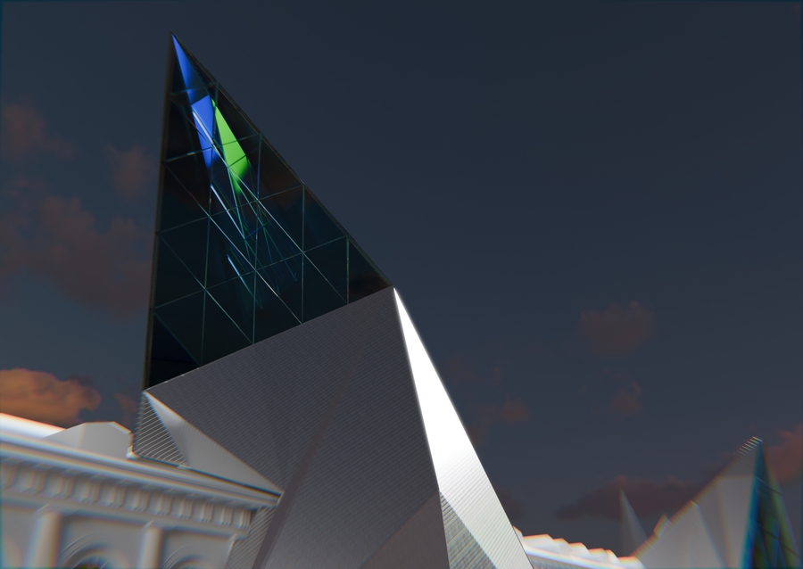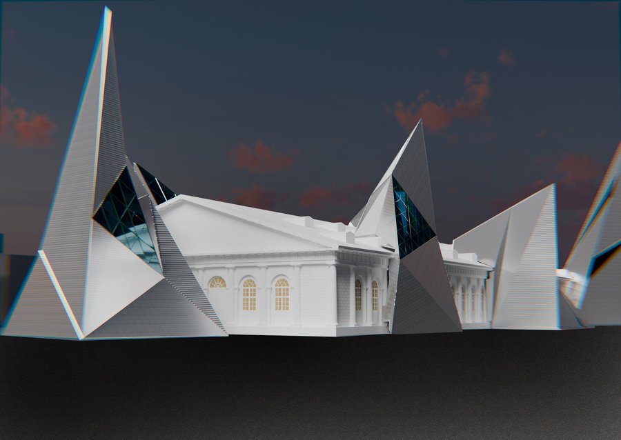 Ключевую роль в моем проекте играет картина Михаила Матюшина «Кристаллизация в пространстве», она символизирует бунт, зарождение нового, стремление выхода за рамки и новаторство. Эти принципы я отразила в графическом фасаде, а также в архитектурном в виде пристроек к манежу в форме кристаллов.