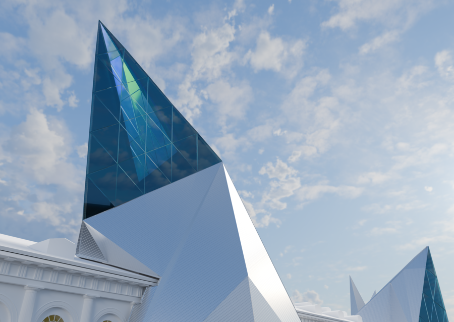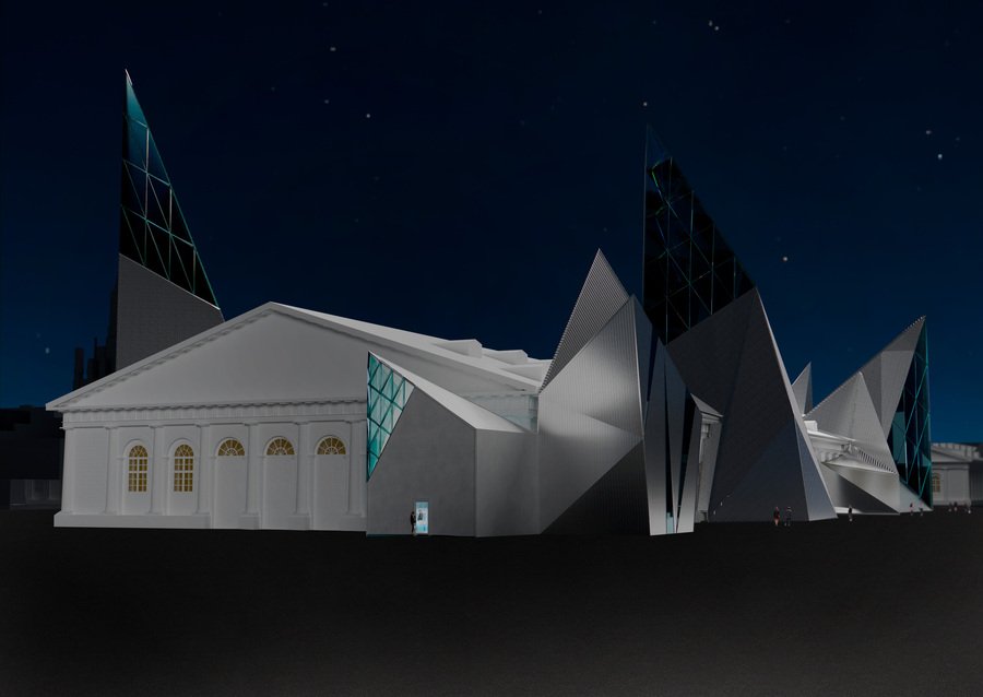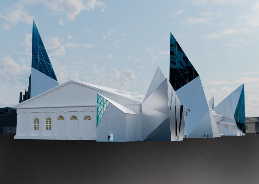 Архитектурный фасад представляет собой пристройки в форме кристаллов, они вырываются наружу, выходя за пределы манежа и привлекая внимание людей, проходящих мимо. Так, кристаллические фигуры символизируют выход за рамки, проявление, стремление привнести в мир что-то новое, впечатляющее.