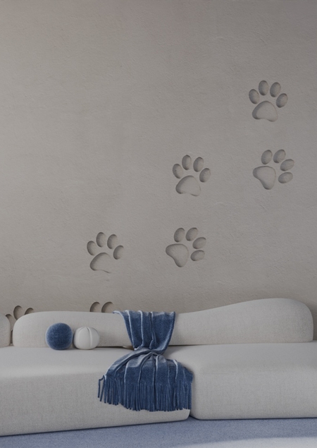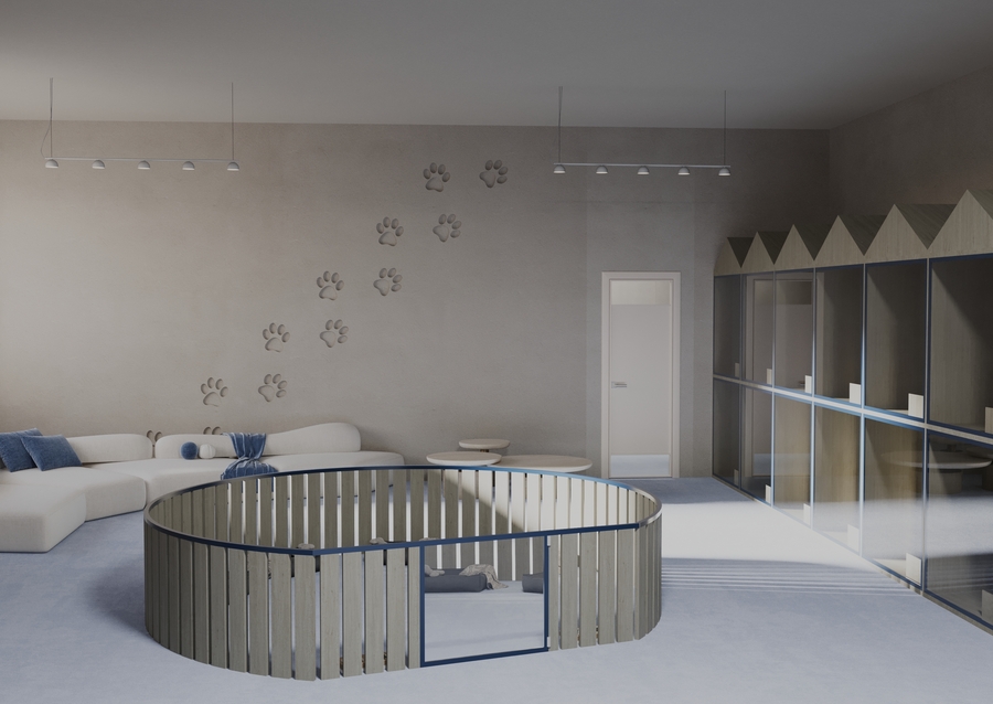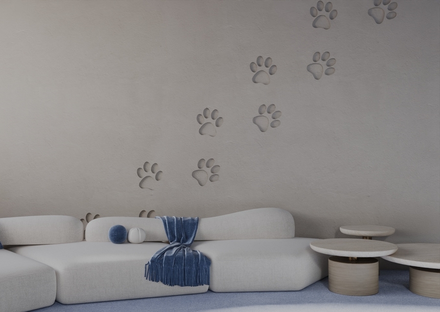 Из-за дихроматического зрения собак, проект выполнен в наиболее приятных и различаемых для них оттенках — синих, серых и бежевых