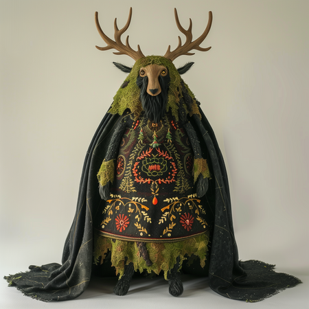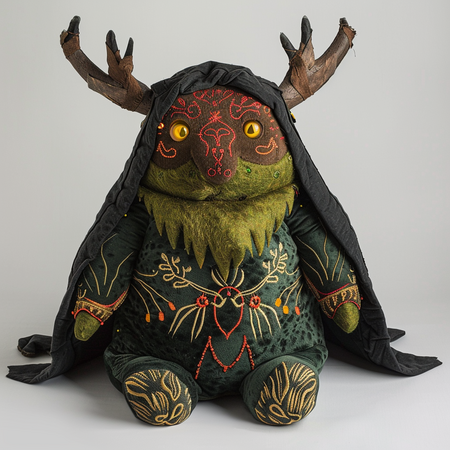 Промпт: «plush toy of a forest spirit character on a white background, he has a large body with black drapes flowing down like a dress, with red traditional russian ornaments, his back is hunched with a big green mossy robe on top, covering the top of his body. His face is hidden by a wooden deer mask, he has yellow pinprick eyes and big antlers. natural color palette, russian ornaments, cute stylised plush, professional promotional photo, soft lighting, white background, 4k»