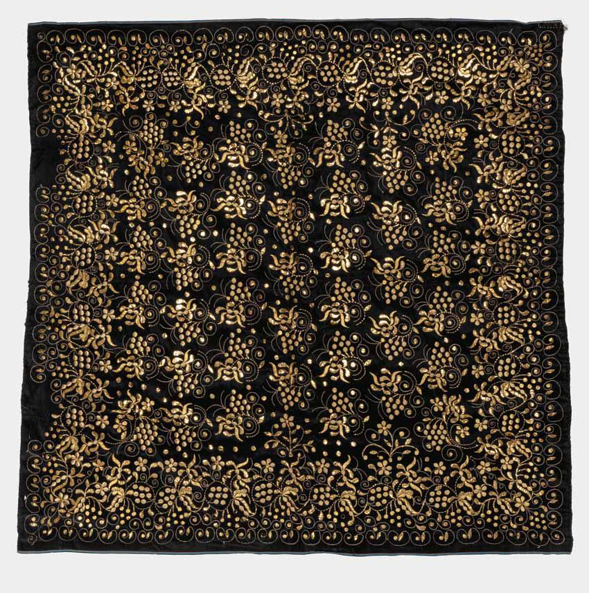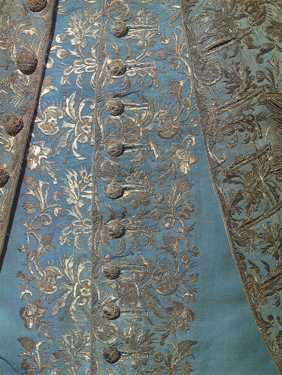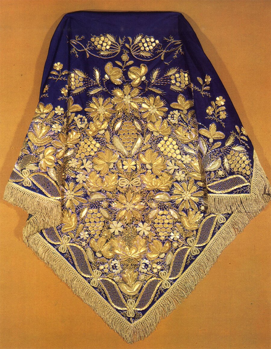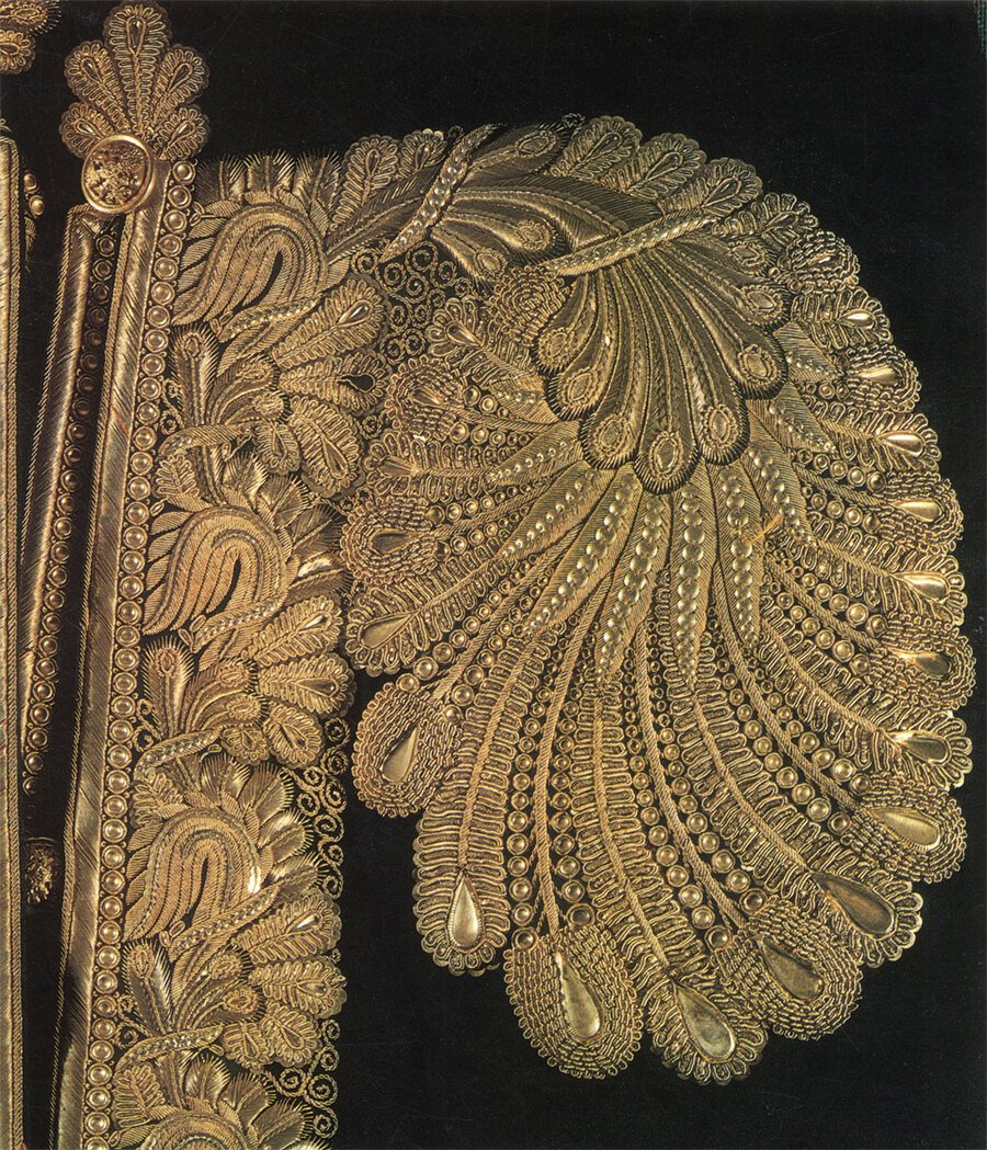 1. Мундир обер-камергера 1-го класса. Деталь. XIX в. 2. Кафтан и камзол Петра I. 1724. Шитье серебряными прядеными нитями по шелку 3. Платок головной. XIX в. Нижегородская губерния.