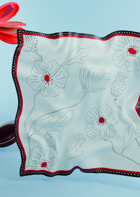 Дизайн платка вдохновлен русскими народными сказками. В узоре платка присутствуют элементы ювелирных букетов Иеремии Позье.