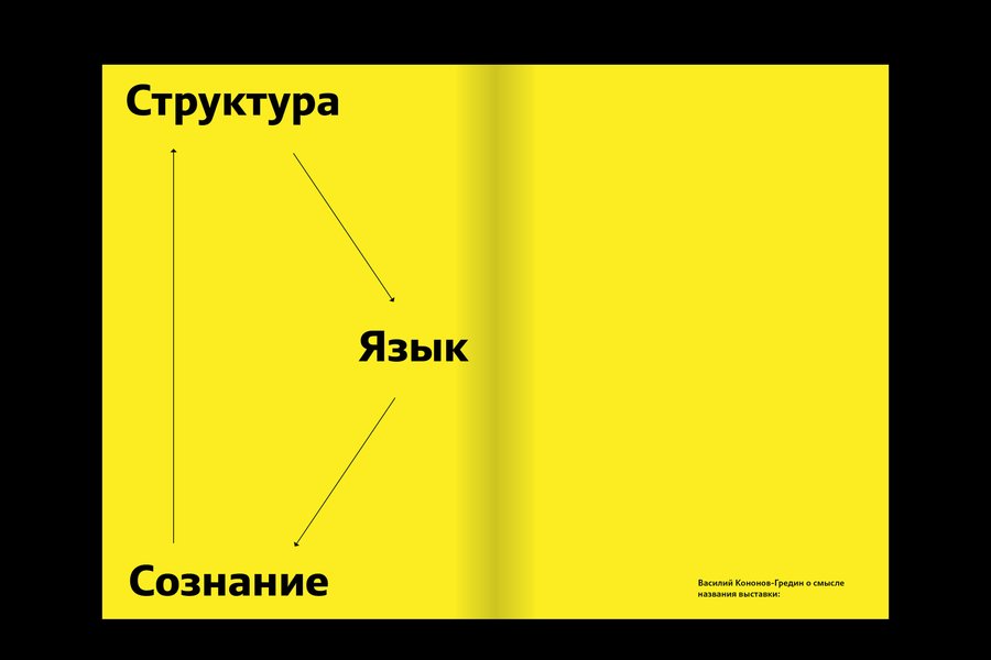 Книга следует логике выставки Василия Кононова-Гредина «Структура — язык сознания», воспроизводя её сюжет. Метафорой каталога становится путь посетителя, который шаг за шагом теряет ориентиры магазина и обнаруживает выставку. Каталог превращается в самостоятельный опыт восприятия. Листая его, читатель постепенно погружается в экспозицию и вместе с ней переосмысливает увиденное.