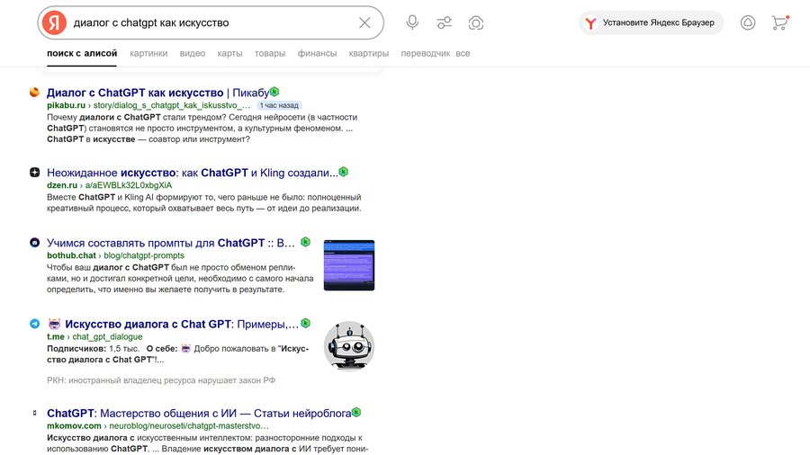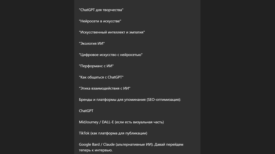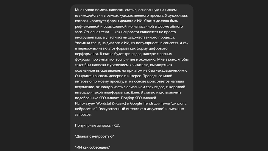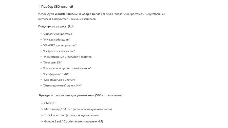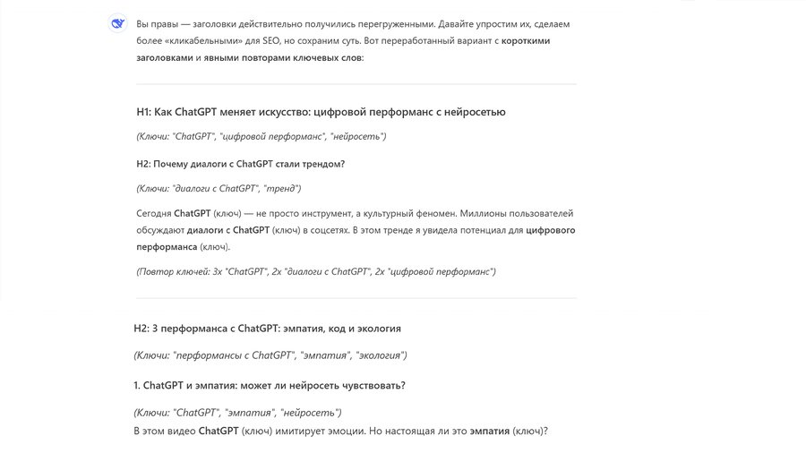 Для SEO-оптимизации я использовала нейросеть DeepSeek: с её помощью были подобраны ключевые запросы по теме (диалог с нейросетью, ChatGPT в искусстве, ИИ как собеседник, перформанс с ИИ и другие), сгенерированы варианты заголовков и подзаголовков, в которые органично встроены эти слова. Я выбрала заголовок, наиболее приближённый к естественному поисковому поведению пользователя: «Диалог с ChatGPT как искусство» — он одновременно отражает суть статьи и звучит как трендовый запрос.