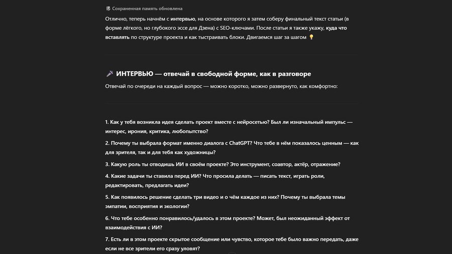 Статья «Диалог с ChatGPT как искусство» было сгенерировано с помощью нейросетей на основе интервью. Нейросеть помогала формулировать размышления, задавала наводящие вопросы и структурировала ключевые мысли о проекте.