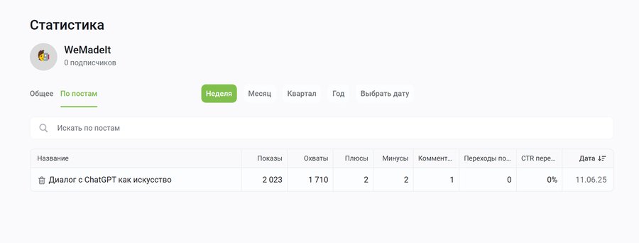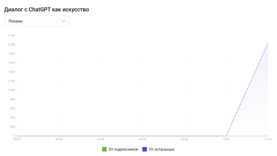 На Пикабу статья «Диалог с ChatGPT как искусство» была размещена 11 июня. Всего за два часа она получила 2023 просмотра при охвате 1710 человек и вызвала умеренное, но живое взаимодействие — 5 реакций. В поисковой выдаче по запросам «диалог с нейросетью» и «диалог с ChatGPT как искусство» статья выходила на первое место в Google и Яндексе, что подтверждает эффективность SEO-ключей и названия публикации.