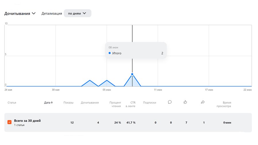 Тот же текст был опубликован на Дзене 3 июня. При этом он набрал всего 4 просмотра (при 12 показах), что свидетельствует об очень низкой органической дистрибуции. Интересно, что несмотря на это, количество взаимодействий составило 7 — чуть выше, чем на Пикабу.