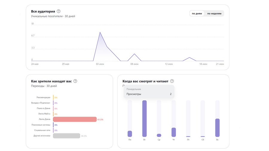 — Удобная статистика есть и в Дзене и Пикабу, нона Дзене она подробнее и включает более подробные графики по аудитории.