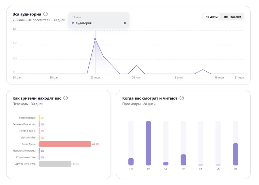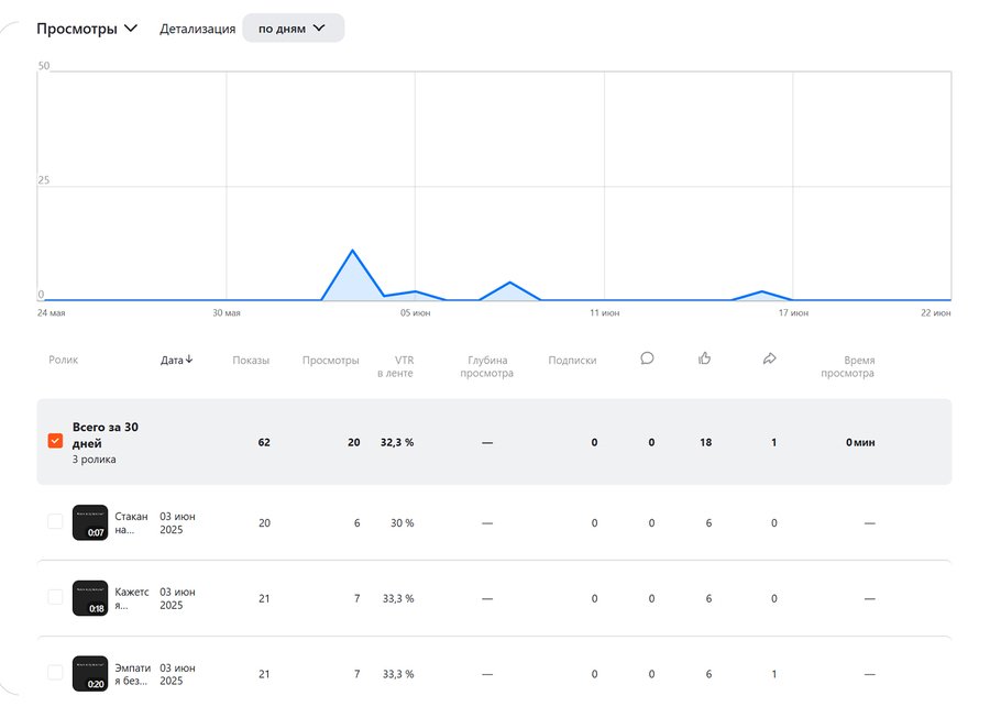Все три видео были опубликованы на Дзене одновременно со статьёй 3 июня. Статистика показывает, что охваты оказались крайне низкими — 6–7 показов на каждое видео. Однако при этом все три ролика собрали одинаковое количество взаимодействий — по 6, что говорит о следующем: