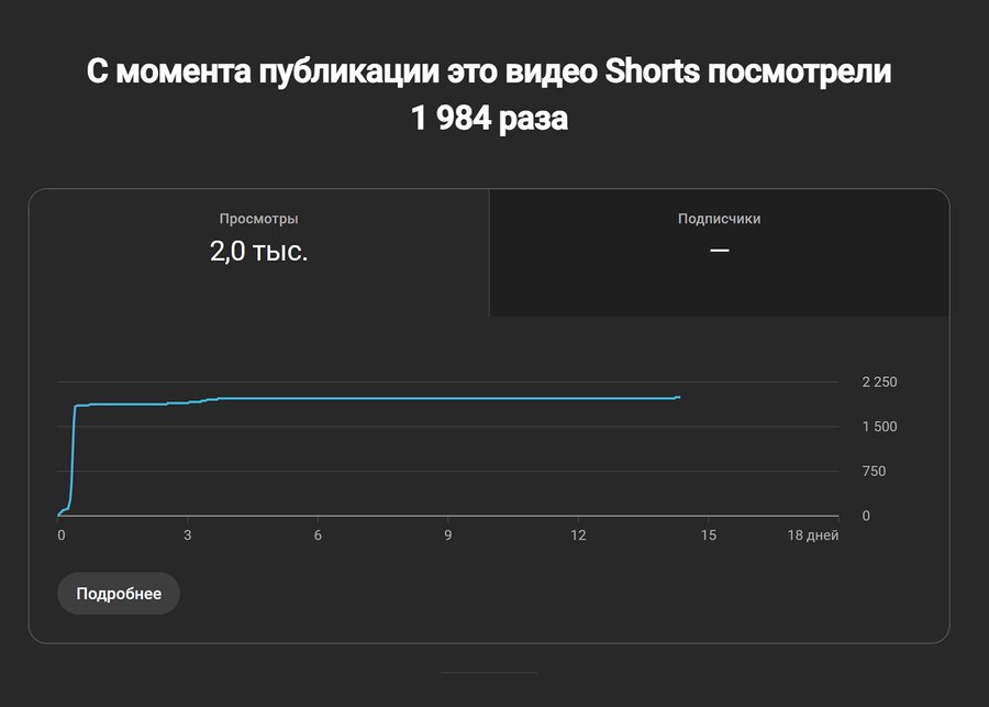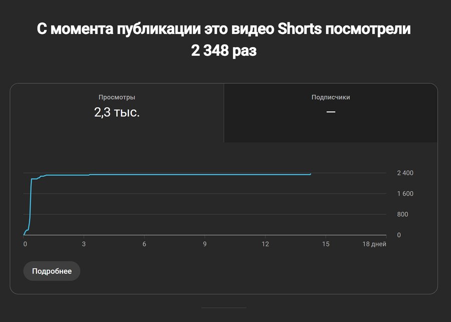 Результаты оказались значительно выше и успешнее чем на Дзене. Видео «Стакан наполовину пуст» стало самым популярным — 2347 просмотров, 8 взаимодействий; «Эмпатия без тела» — 1975 просмотров, 6 взаимодействий; «Кажется, дождь собирается» — 396 просмотров, 4 взаимодействия.
