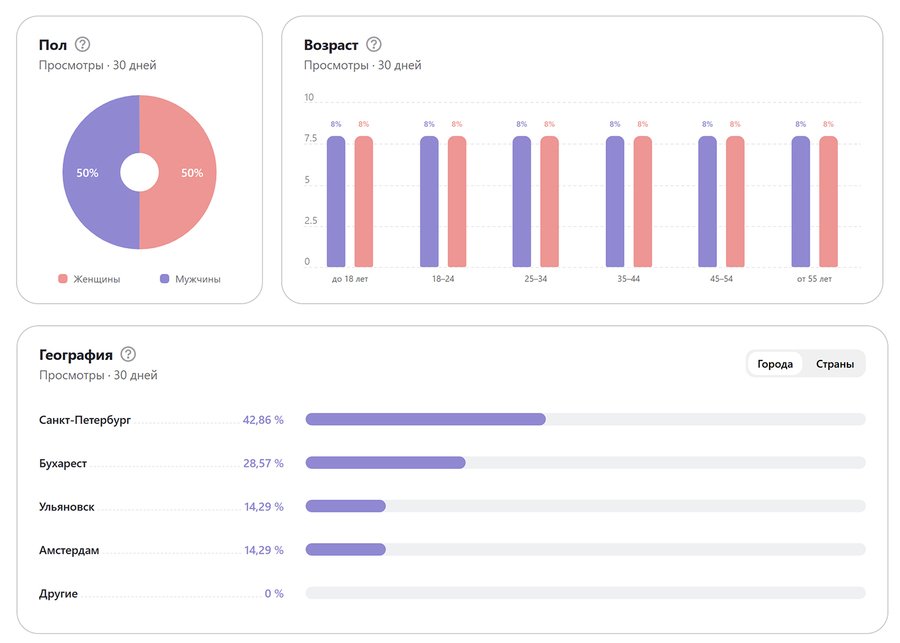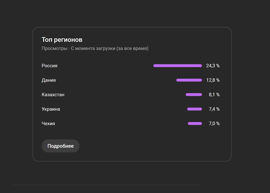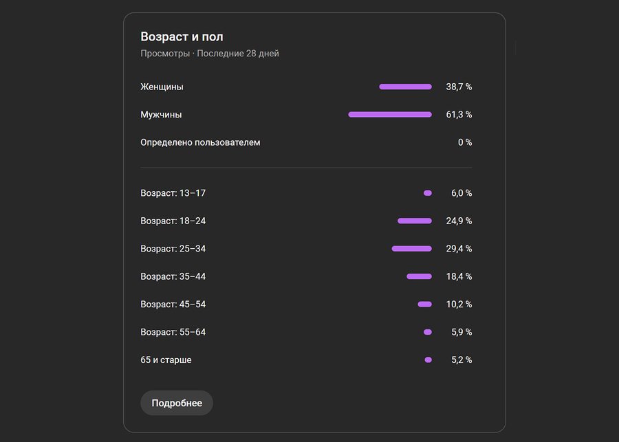 — Аудитория в основном из России и возраст варьируется в возрастных группах от 18 до 55. Потенциально стоит попробовать контент на английском языке или с субтитрами, особенно на YouTube для повышения просмотров и привлечения большей аудитории.