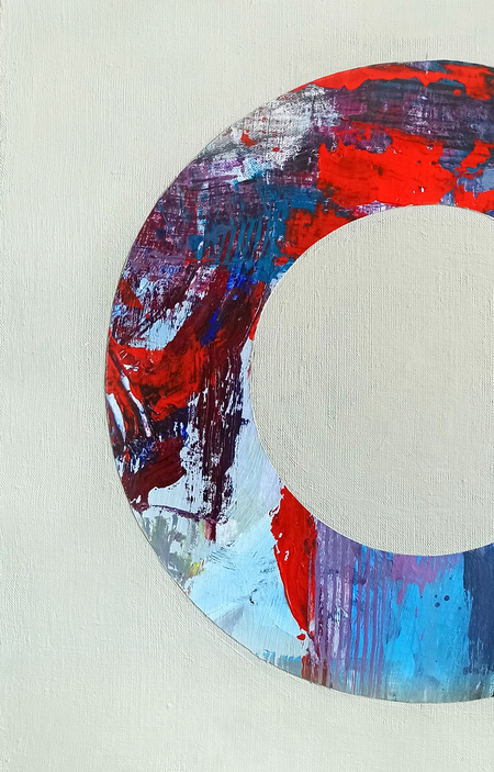 Язык абстракции помог мне показать этот распад цельности, в который вплетены посторонние элементы, рождающие внутренний хаос и неопределённость. Картины буквально сотканы из частиц мировосприятия, претерпевшего крах. Форма круга тоже тут неспроста. То, что для нас является значимым событием, в масштабах мира и планеты — лишь крупица в водовороте истории, колесо явлений, которые уже не раз происходили и будут происходить.