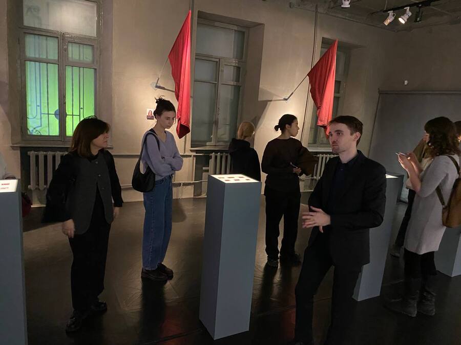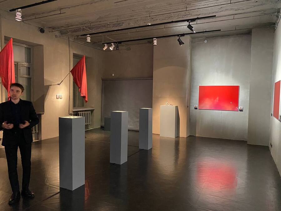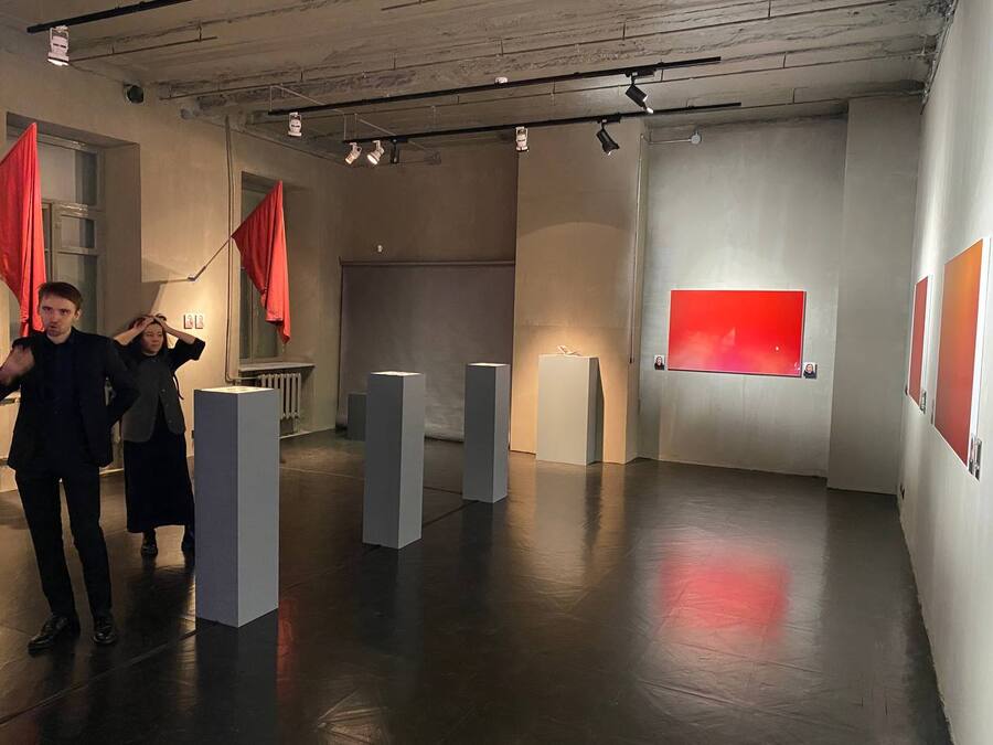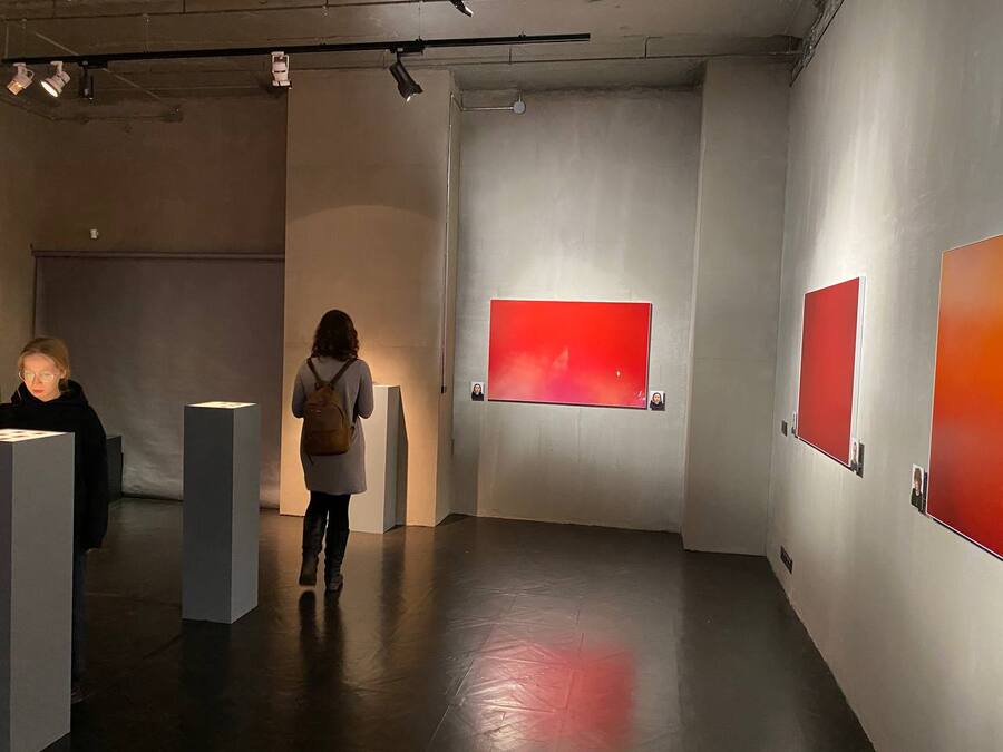 Экспозиционное пространство функционально поделено в соответствии с эффектом, который выставка призвана производить на посетителя: три стены представляют полотна триптихов «Обиды», несущая стена с окнами, от которой на картины проливается свет, декорирована красными флагами, символизирующими отсылку к известной картине «Большевик» Бориса Кустодиева, а в центре выставочного пространства на предметных столиках под стеклом аккуратно выложены ресурсы фотоколлекции — сами проявленные отрезки фотоплёнки. Картины центральной части триптихов распределены по принципу интуитивного следования автором за субъективным восприятием гармонии в психологии цвета: от агрессивного присутствия белого на алом фоне до спокойных плавных переходов градиента из алого и арко-красного в жёлтый и оранжевый, и белые засветы на красном фоне у участников эксперимента, не утерпевших и извлекших фотоплёнку раньше срока.