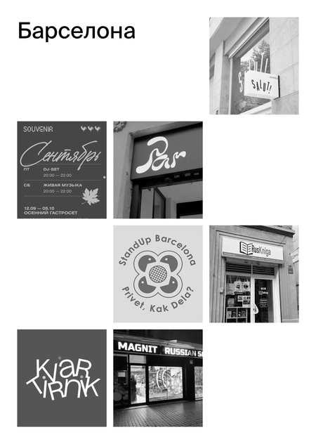 В разделе рассматриваются знаки русскоязычных инициатив и бизнесов в Барселоне: рестораны, книжные и медиа-проекты, сервисы и ивенты. Подборка собрана из витрин, упаковки и публичных профилей в соцсетях. В этой выборке логотипы решают задачу долгосрочной узнаваемости, поэтому язык и стиль выбираются осторожно.