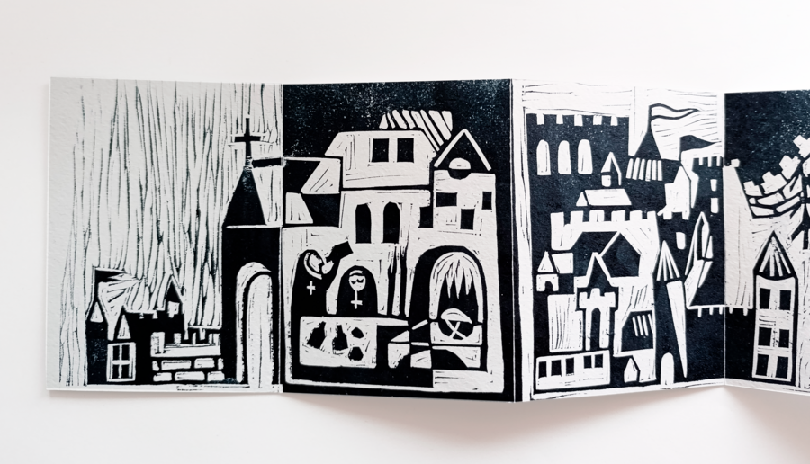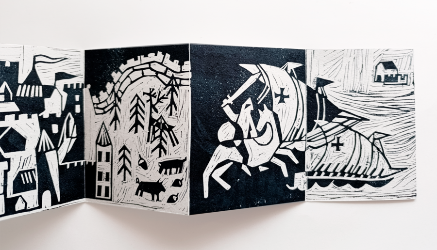 Серия работ в технике высокой печати, посвященная Средним векам: длинный зин с краткой историей еды в средневековой Европе, начиная с триады и заканчивая крестовыми походами; отдельные гравюры в той же технике и набор стикеров с главным героем, рассказчиком всех событий.