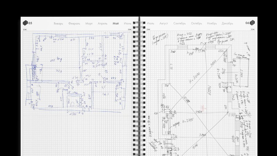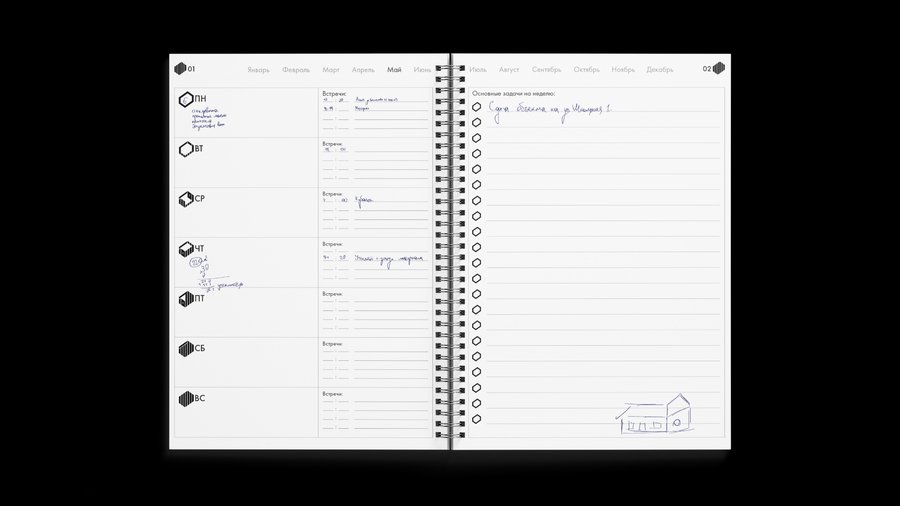 Блокнот разделён на два блока. Левая сторона включает в себя клетчатое поле для чертежей/замеров, правая — имеет вид ежедневника