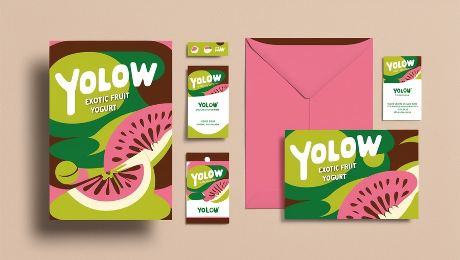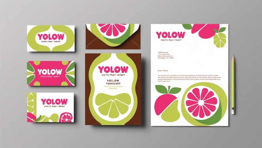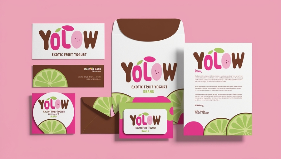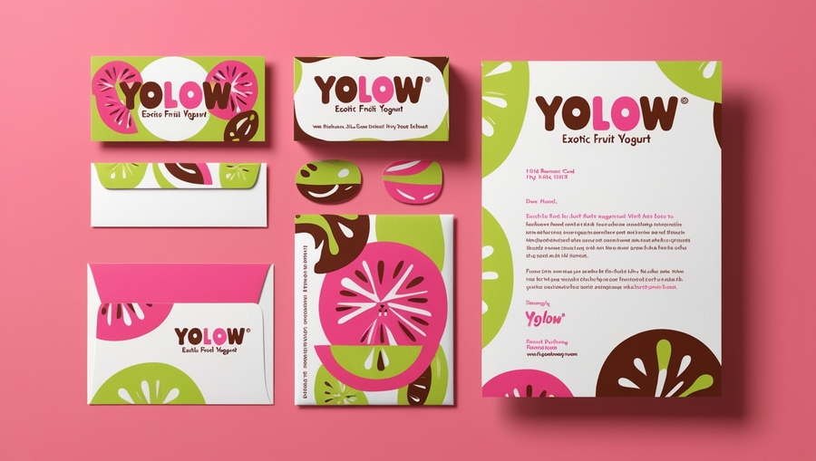 /promt: create a 'YOLOW' yogurt mockup with a business card, envelope, and letterhead in a playful retro style. Use pink, lime green, and brown, with rounded typography and fruit-inspired shapes in a flat, layered design
