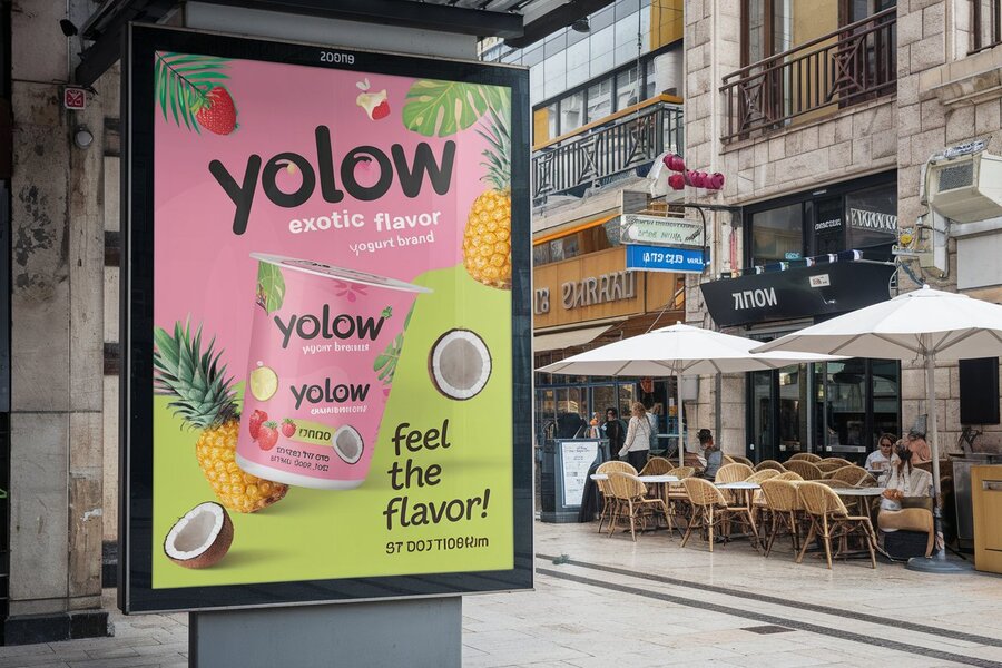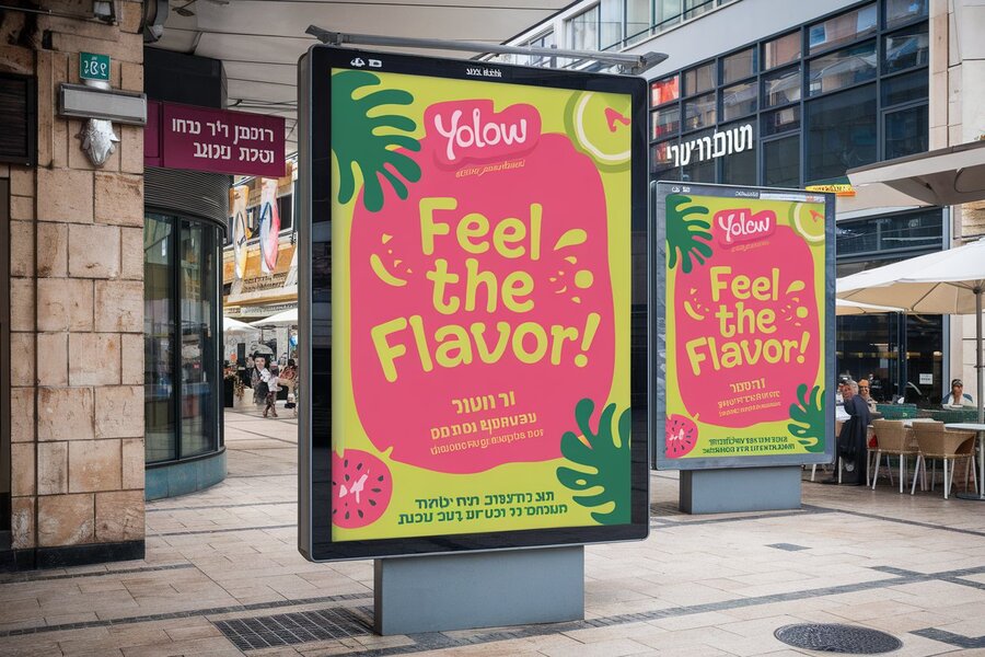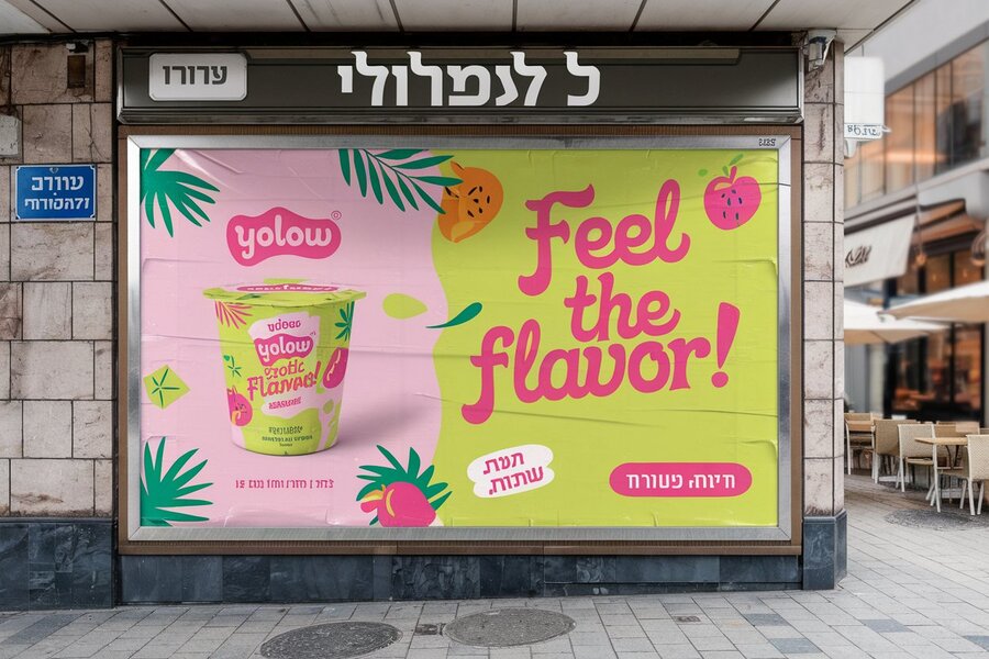 /promt: create a mockup of a 'YOLOW' yogurt poster with the slogan 'Feel the Flavor! ' in bold, playful typography, using pink and lime green. The billboard is set in a vibrant urban Israeli environment with stone buildings, Hebrew signage, and bustling streets. The design features tropical fruit illustrations and playful shapes, giving the poster an exotic, fresh feel that stands out in the lively cityscape.