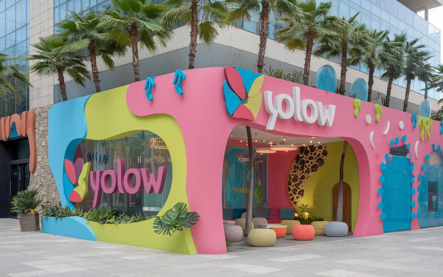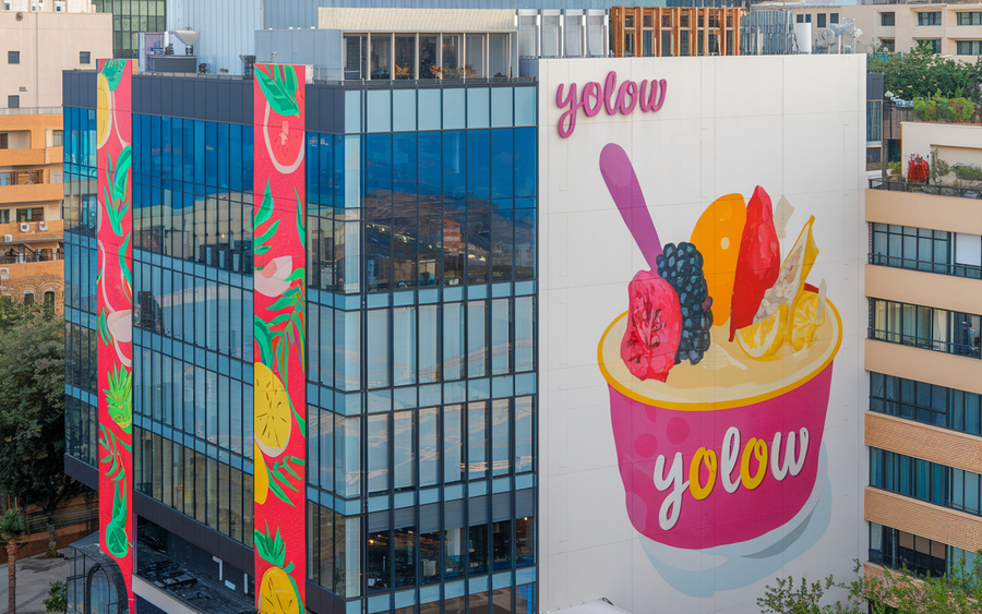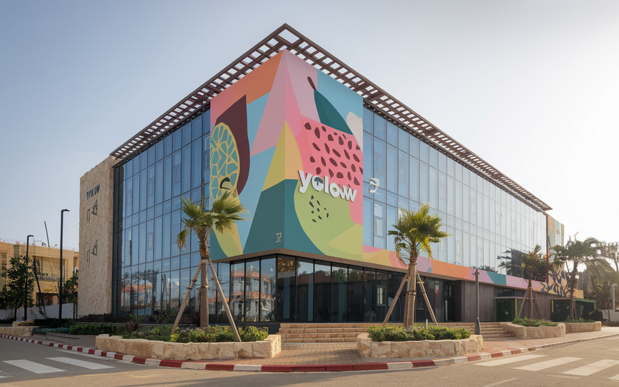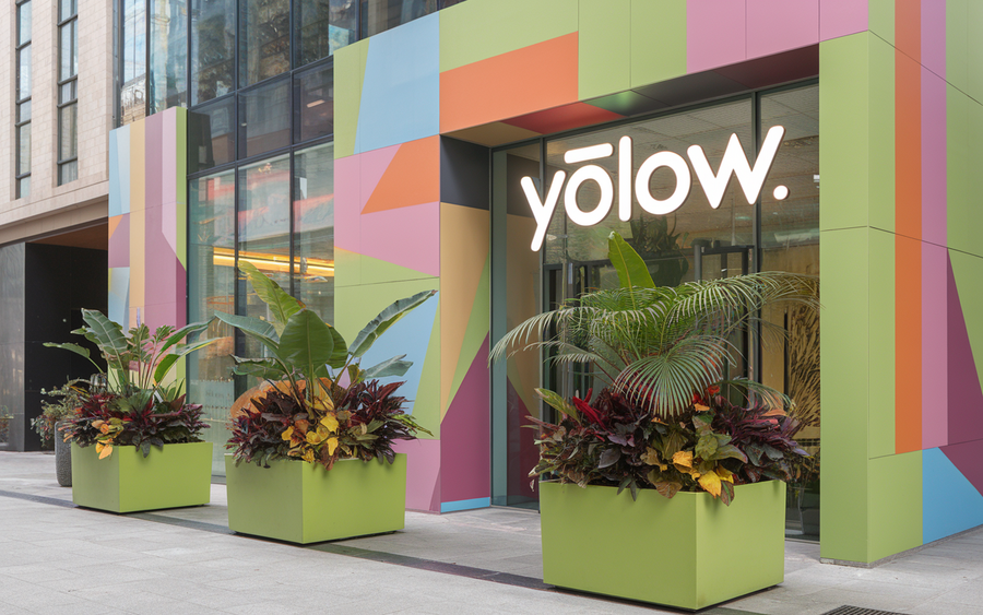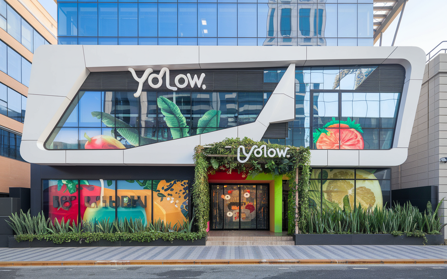 (2) /promt: an innovative and creative office building in central Tel Aviv for 'YOLOW, ' an exotic yogurt company. The design combines modern architecture with nature-inspired details, like large planters with tropical plants at the entrance and colorful geometric patterns on the building’s exterior. The branding is bold and fun, with the 'YOLOW' logo displayed prominently. The overall aesthetic is fresh, inviting, and vibrant, reflecting the exotic flavors of the yogurt