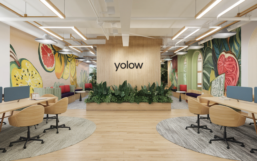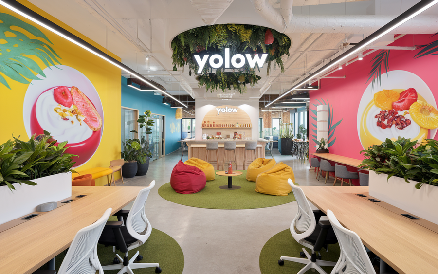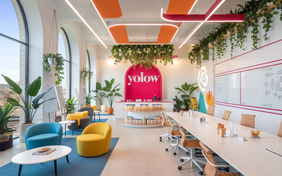 (1) / promt: the 'YOLOW' office features a sleek, tropical design with white walls and bold, colorful accents. It includes collaborative areas, comfortable seating, and whiteboards. Large windows let in natural light, and greenery fills the space. Modern workstations and a central kitchen showcase yogurt products while serving as a breakroom