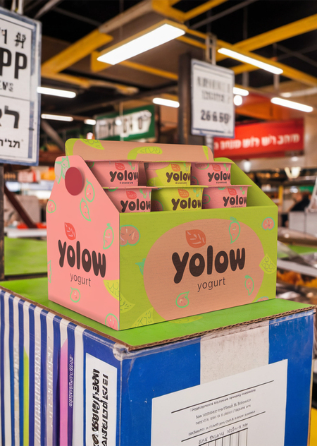 /promt: create a mockup of an eco-friendly carton box with 'YOLOW' yogurt cups, featuring pink, lime green, and brown colors and playful fruit patterns. The box is displayed on a market stall or grocery shelf in an Israeli setting with Hebrew signage, reflecting the brand’s sustainable identity.