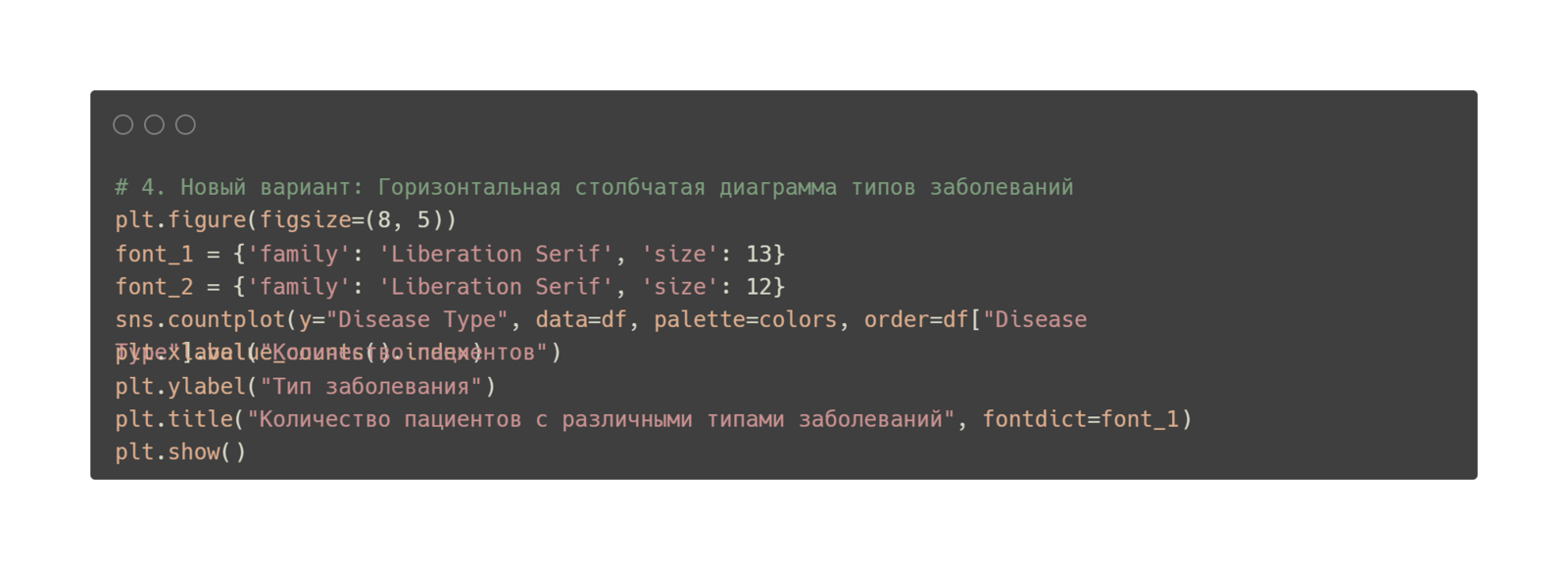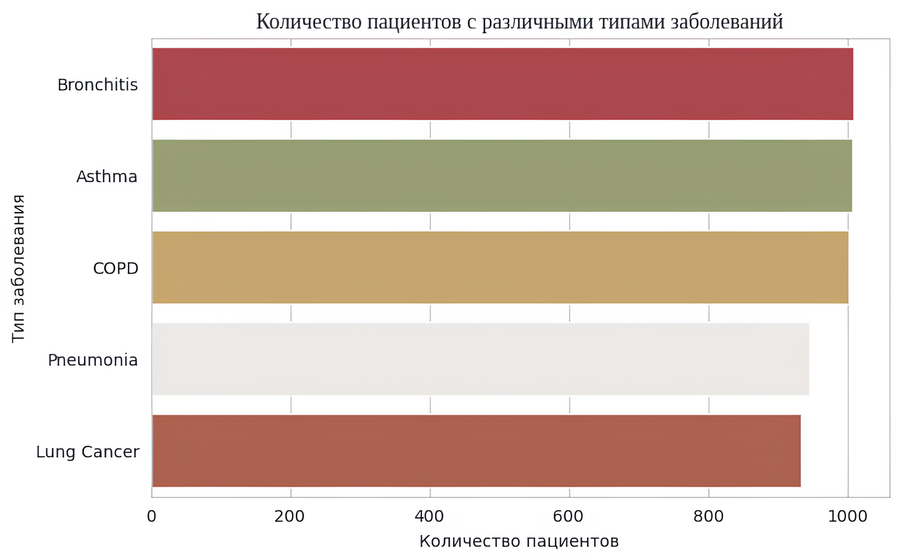 Горизонтальная столбчатая диаграмма демонстрирует распределение количества пациентов по различным типам заболеваний легких. Бронхит, астма и ХОБЛ являются наиболее распространенными заболеваниями в данной выборке, в то время как рак легких и пневмония встречаются реже.