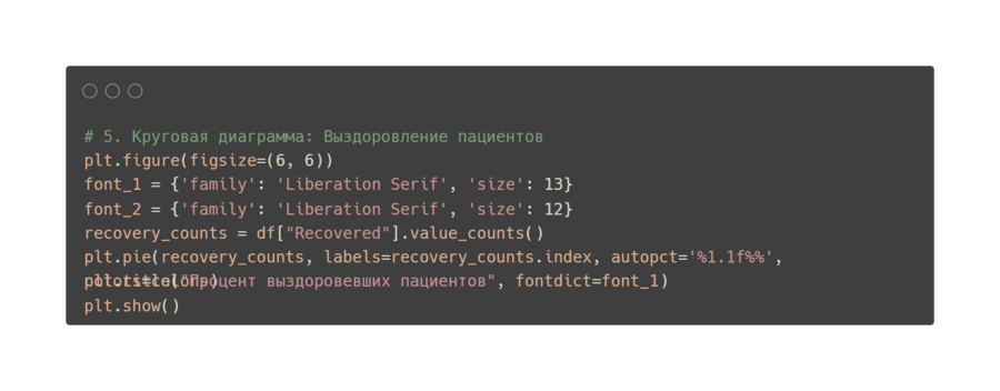 Для визуализации данных я выбрала круговую диаграмму (наглядно показывает процент выздоровевших и соотношение полов), гистограмму (легче всего понять количество пациентов в конкретном возрасте), столбчатую диаграмму (увидеть, как курение влияет на наличие заболевания), горизонтально столбчатую диаграмму (самые распространение заболевания) и тепловую карту корреляции (попытаться найти взаимосвязь между разными факторами).