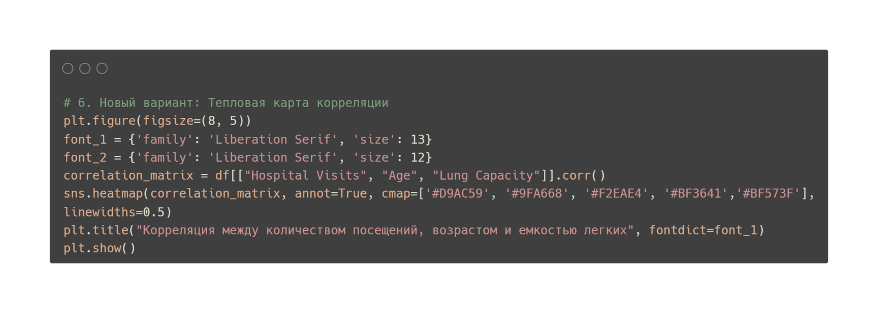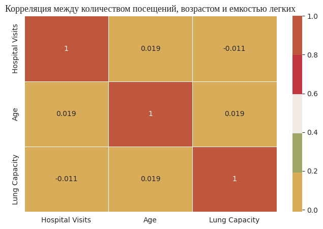 Представленная тепловая карта корреляции демонстрирует отсутствие значимой линейной взаимосвязи между количеством посещений больницы, возрастом пациентов и емкостью их легких. Все коэффициенты корреляции между этими переменными находятся вблизи нуля (0.019 или -0.011), что говорит о том, что увеличение или уменьшение одного из этих параметров не связано с предсказуемым изменением других.