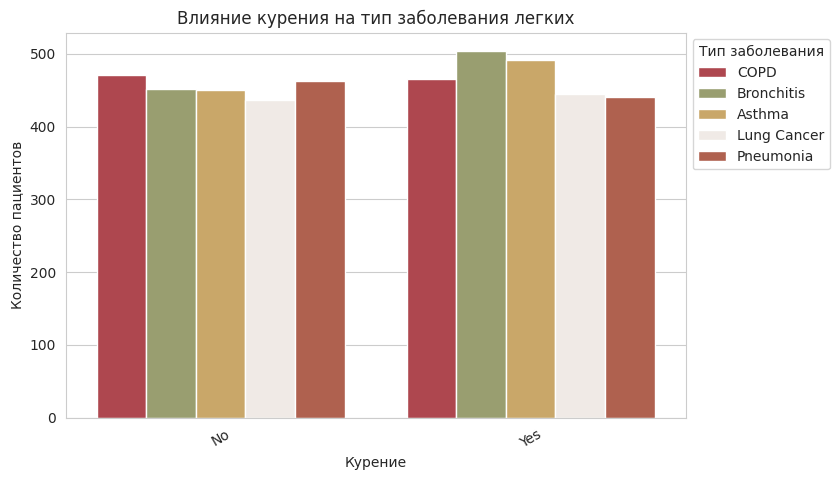 Представленная столбчатая диаграмма показывает влияние курения на различные типы заболеваний легких. Визуально можно заметить, что для большинства заболеваний (ХОБЛ, бронхит, астма) количество пациентов среди курящих немного выше, чем среди некурящих. Однако, особенно важно отметить, что пневмония имеет относительно высокую распространённость как среди курящих, так и среди некурящих, а количество заболевших раком легких явно больше у курящих.