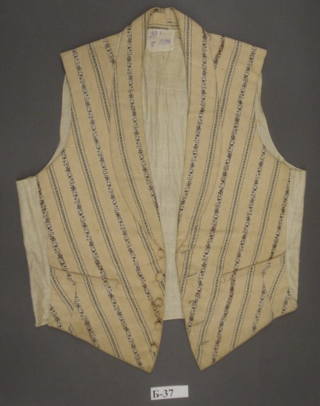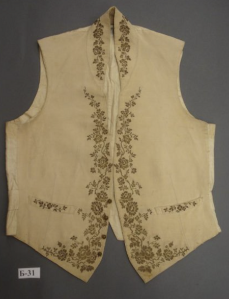 Эти два жилета показывают, что визуальный код западничества работал даже при разном бюджете: будь то роскошная парча или скромное сукно, главным оставался сам принцип следования европейскому крою и принятому этикету. Простой жилет с цветочным узором мог бы быть осознанным выбором разночинца, демонстрирующим, что принадлежность к «европейской партии» определялась не богатством, а верностью определенному визуальному канону, в котором скромный костюм должен был читаться как современный. Тем более, что часто для того, чтобы вписаться в общественную досуговую жизнь менее состоятельные по рождению сословия выбирали приверженность моде как общепринятую условность, хороший тон.