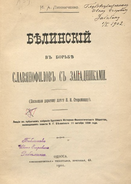 (1) «В борбье славянофилов с западниками» Лекции В. Г. Белинского // Одесса, 1901 г. (2) Первый выпуск журнала Москвитянин // Москва, 1830 г.