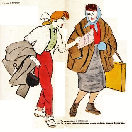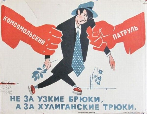 Карикатуры на стиляг в советской сатирической прессе 1950-60-х годов стали прямым продолжением «костюмной войны» XIX века, перенеся конфликт «национального» и «западного» в новые идеологические условия. Визуальный образ стиляги концентрировался на гипертрофированных деталях: невероятно узкие брюки-дудочки, пестрый пиджак с преувеличенными плечами, галстук-«петух» кислотных расцветок и набриолиненные волосы — все эти элементы подавались как гротескная пародия на «буржуазный» вкус. Журналы «Крокодил» и «Смена» тиражировали сюжеты, где стиляги изображались маргинальными фигурами: танцующими под джаз в ущерб труду, падкими на западные безделушки и противопоставляющими себя «здоровому» советскому коллективу. Особый акцент делался на социальном диссонансе: молодые люди из советских семей, подражавшие западным образам, представлялись идеологическими перерожденцами. Эта сатира, как и век назад, работала с кодом одежды как политическим текстом.