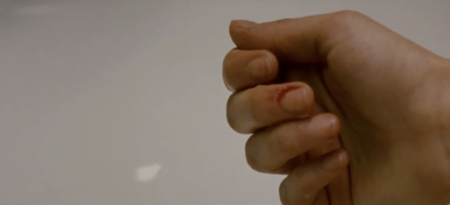 В начале фильма зритель узнает, что главная героиня ночью неосознанно расчесывает себе кожу на спине — так выражаются ее переживания по поводу возможной роли. После того, как ее все же выбирают на эту роль, Нина пытается избавиться от заусенца, и ей начинает мерещиться, что она сдирает с пальцев кожу. Царапины на спине и несуществующие раны на руках — это первые в фильме переживания героини, которые проявляются физически.