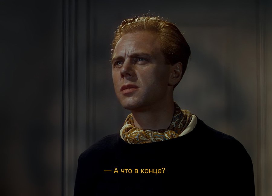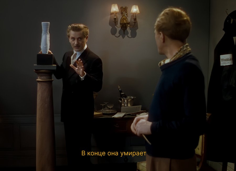 Вики погибает, и Лермонтов буквально делает ее невидимой на сцене. Балерина не участвует в постановке, но труппа притворяется, что она там есть. Таким образом, смерть творческого человека и его невидимость для зрителя смешивается в приведенном фильме.