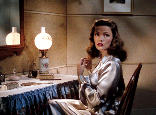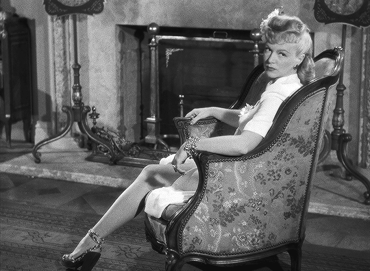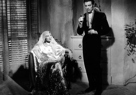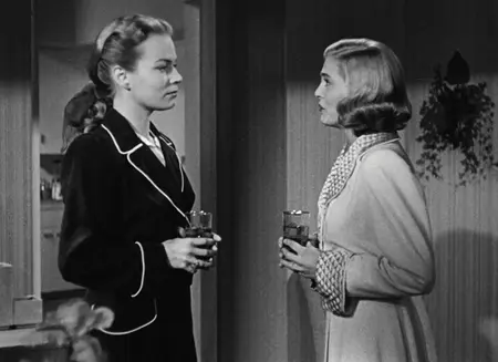 В «Это убийство, моя милочка» (1944) Хелен Грейл, воплощающая архетип роковой женщины, предстаёт в элегантном белом наряде, который сразу выделяет её среди других персонажей. Белый цвет здесь функционирует не только как визуальный акцент, но и как маркер социальной дистанции: на фоне тусклой, почти обезличенной среды, в которой действует детектив, её облик кажется тщательно сконструированной маской престижа и контроля. Светлая одежда подчёркивает её отстранённость и делает фигуру Хелен почти недосягаемой — как будто она всегда на шаг впереди, холодна и непроницаема. Этот эффект усиливается её пластикой и манерой речи: костюм становится продолжением её способности манипулировать пространством и людьми, закрепляя доминирующее положение героини в кадре и в иерархии внутри повествования.