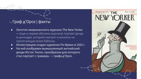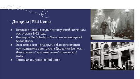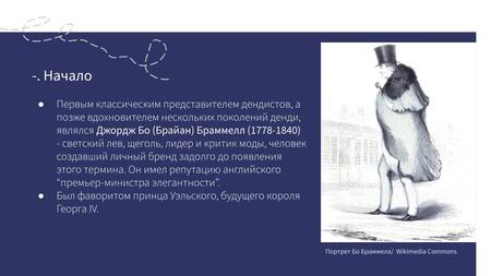 «…Мы „проживём“ с вами историю дендизма от его зарождения в конце XVIII века до расцвета в XIX веке и последующего перерождения в XX веке. Увидим, как трансформировалось это движение в современном мире.»