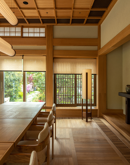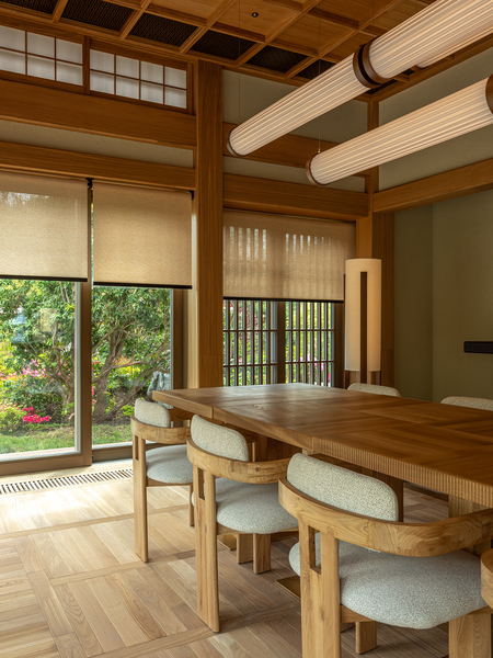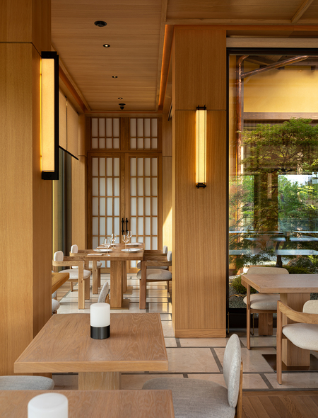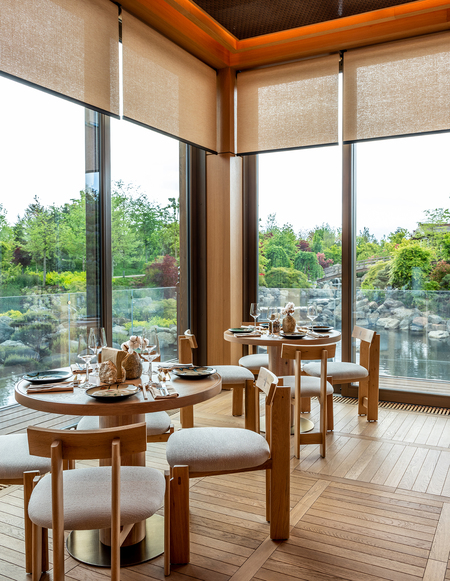 Japanese-style restaurant is an atmospheric space with the preserved authentic elements of Japanese food culture and aesthetics. Natural light wood, rough stone, textured wool contrasts with a warm, pleasant atmosphere with right accent light, bonsai trees and a picturesque view of the garden. Our mission was to avoid the clichés associated with Japanese cuisine establishments and develop something relevant and unique for Galitsky Park.