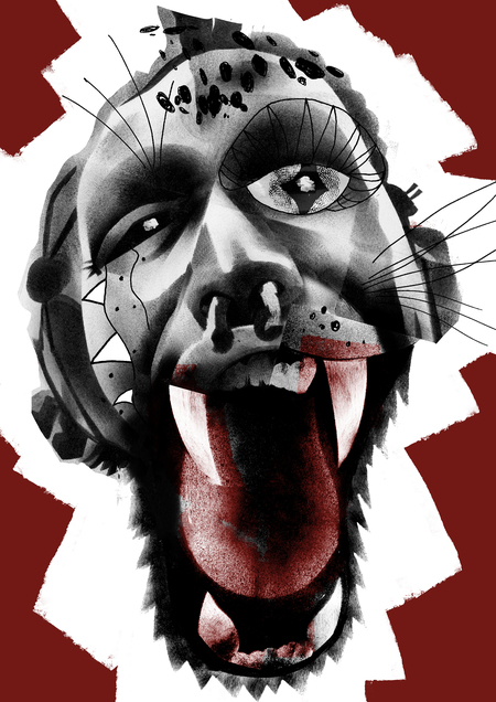 Это ягуар, притаившийся в кустах с голодным видом, или кайман, выжидающий свою добычу? Нет, это Средний Глаз до того озверевший, что его уже не отличить от животного. Серия портретов запечатлевает трансформацию индейца. Работы собраны как коллаж из портретов и изображений животных.