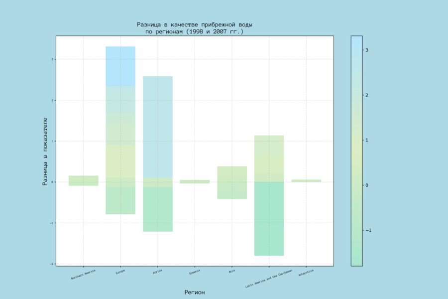 Как мы видим, наибольший рост концентрации хлорофилла-а произошел в Европе, что наиболее вероятно связано с поздним внедрением мер по экологической безопасности, несмотря на принятие решений Директивой ЕС по водным ресурсам (2000 г.) и конвенции ОСПАР[2]. Некоторые страны отставали в улучшении очистки сточных вод и сокращении использования удобрений. Наибольшее снижение в Латинской Америке, что может быть связано с одним из периодов Эль — Ни́ньо в 1998, 2002 и 2006–07 [3][4].