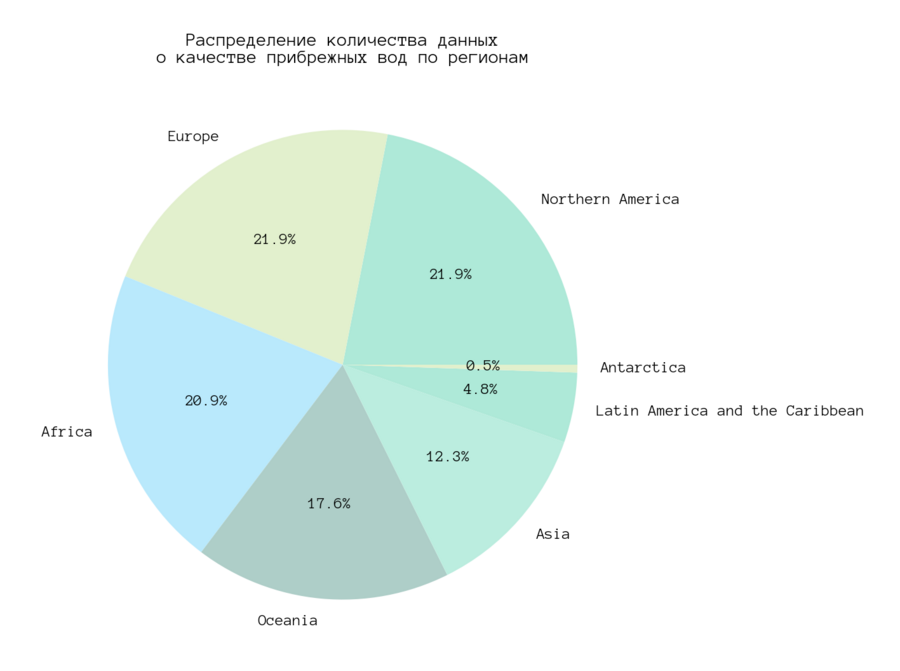 Для оценки объективности данных была применена круговая диаграмма, показывающая распределение количества данных по каждому региону. Как мы видим, наибольший объем данных представлен в регионах Европы и Северной Америки (21,9%), в тройке также данные о Африке (разница в 1%). Наименьший объем данных представлен по Антарктике, что может быть связано с труднодоступностью региона, а также отличающимся климатическим поясом. Хочется также отметить отсутствие данных об Арктическом регионе и сравнительно малый процент данных об Азии (12,3%).