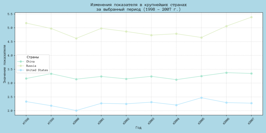 Далее проведен анализ динамики изменений по годам за выбранный период, наиболее интересным мне показалось визуализировать данные по России, сравнить их с Китаем и США, а также создать график по всем регионам.