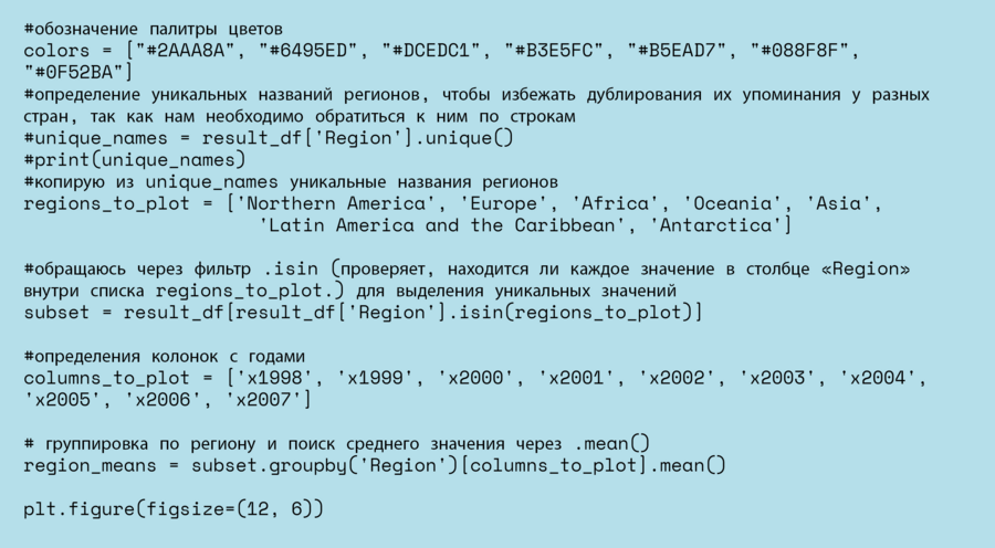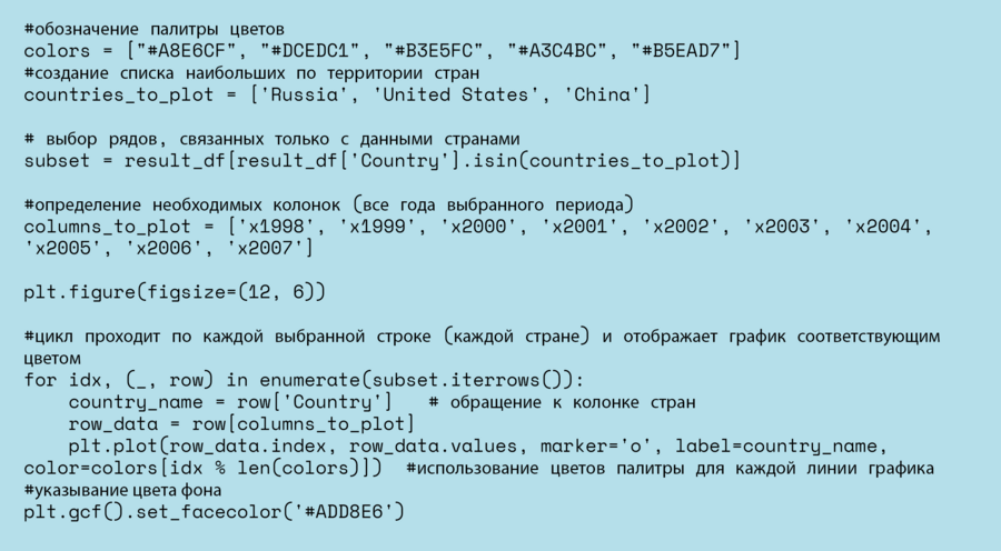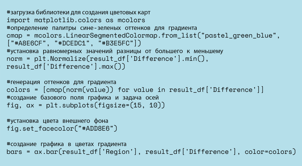 Для работы со сложными объединениями, палитрами цветов и созданием градиента на графиках я обращалась к Chat-GPT. Посмотреть использованные промпты можно в разделе «Описание применения генеративной модели».