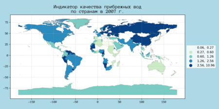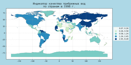 Нормальным показателем концентрации хлорофилла-а является диапазон 1 — 5 µg/L, как мы видим из трех представленных стран Россия находится в наибольшей зоне риска, повышена вероятность цветения прибрежных вод. Самая чистая вода с минимальным индикатором — США.