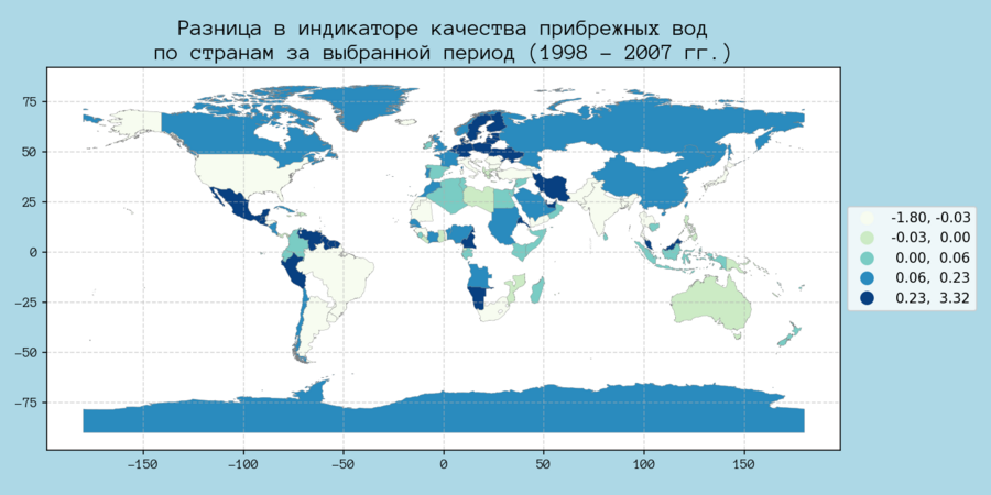 Ранее был представлен линейный график с разницей по странам, но для наглядности и более подробного изучения, я выбрала географические диаграммы, так как количество информации о каждой стране не так явно читается на других типах графиков. Здесь же мы вновь видим рост показателя в регионе Европы, однако теперь можем наблюдать, что это в основном страны Северной Европы, чаще с выходом к океану. Также можно отследить отсутствие средних значений и явную контрастность среди стран Латинской Америки, какие из них больше подвержены росту концентрации, какие, наоборот, снижению.