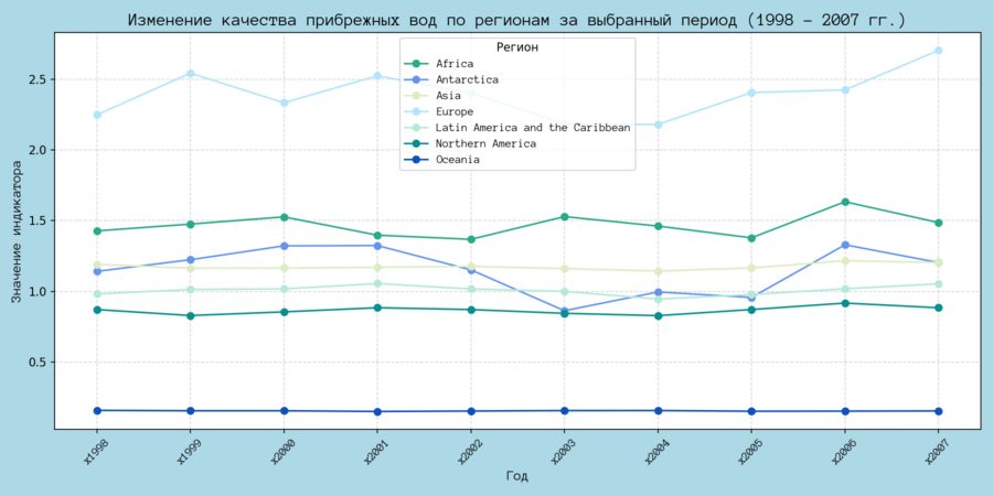 В целом, наблюдается некоторая усреднённость значения индикатора по большинству регионов, самые низкие показатели в Океании, самые высокие концентрации характерны для Европейского региона. Основные причины [5]: загрязнение питательными веществами от сельского хозяйства и промышленности, изменение климата и потепление вод, снижение естественного контроля фитопланктона (чрезмерный вылов рыбы), контроль загрязнения еще не был полностью эффективным.