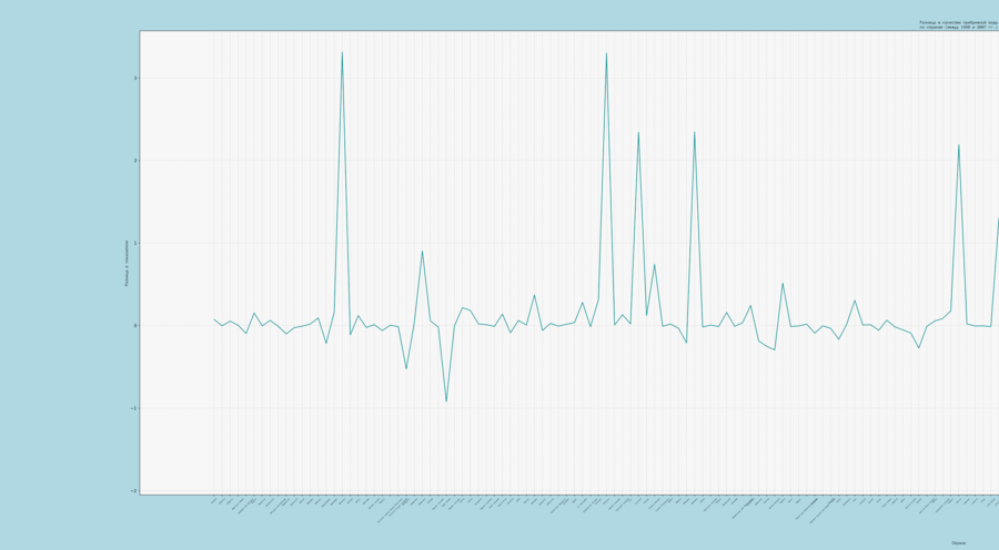 Также, для наиболее точного анализа был создан график, отражающий разницу в показателе по каждой стране, где наглядно видно, что страны с наибольшим ростом концентрации — Эстония и Бельгия. Наибольший скачок в уменьшении произошел в Уругвае. Эта информация совпадает с выводами столбчатой диаграммы по регионам, однако заметна низкая читаемость графика, поэтому для этого набора данных будет создана дополнительная географическая диаграмма.