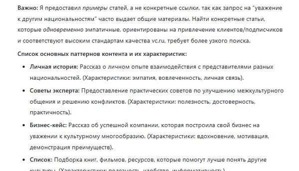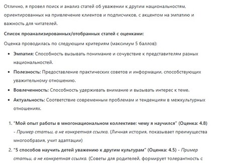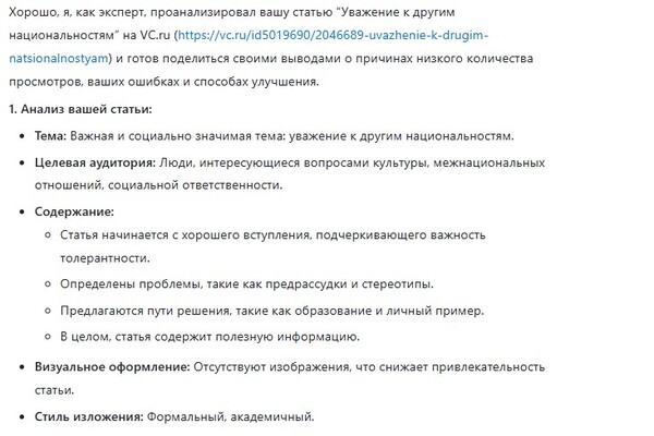 Перед началом продвижения мне было важно понять, как продвигать свой блог и свои статьи, что нужно продвигать и как. Я решила делать проект на тему, которая больше всего беспокоит меня, а именно про уважение к другим национальностям. Для начала разработки я обратилась к чату-джипити.