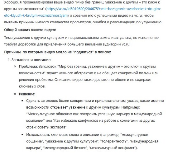 представь, что ты эксперт. На основе моего видео https://vc.ru/id5019690/2046759-mir-bez-granic-uvazhenie-k-drugim-eto-klyuch-k-krutym-vozmozhnostyam проанализируй какие ошибки я допустила, почему мое видео не поднлось в поиске, а также проанализируй успешные видео на vc/ru и напиши, в чем у нас разница