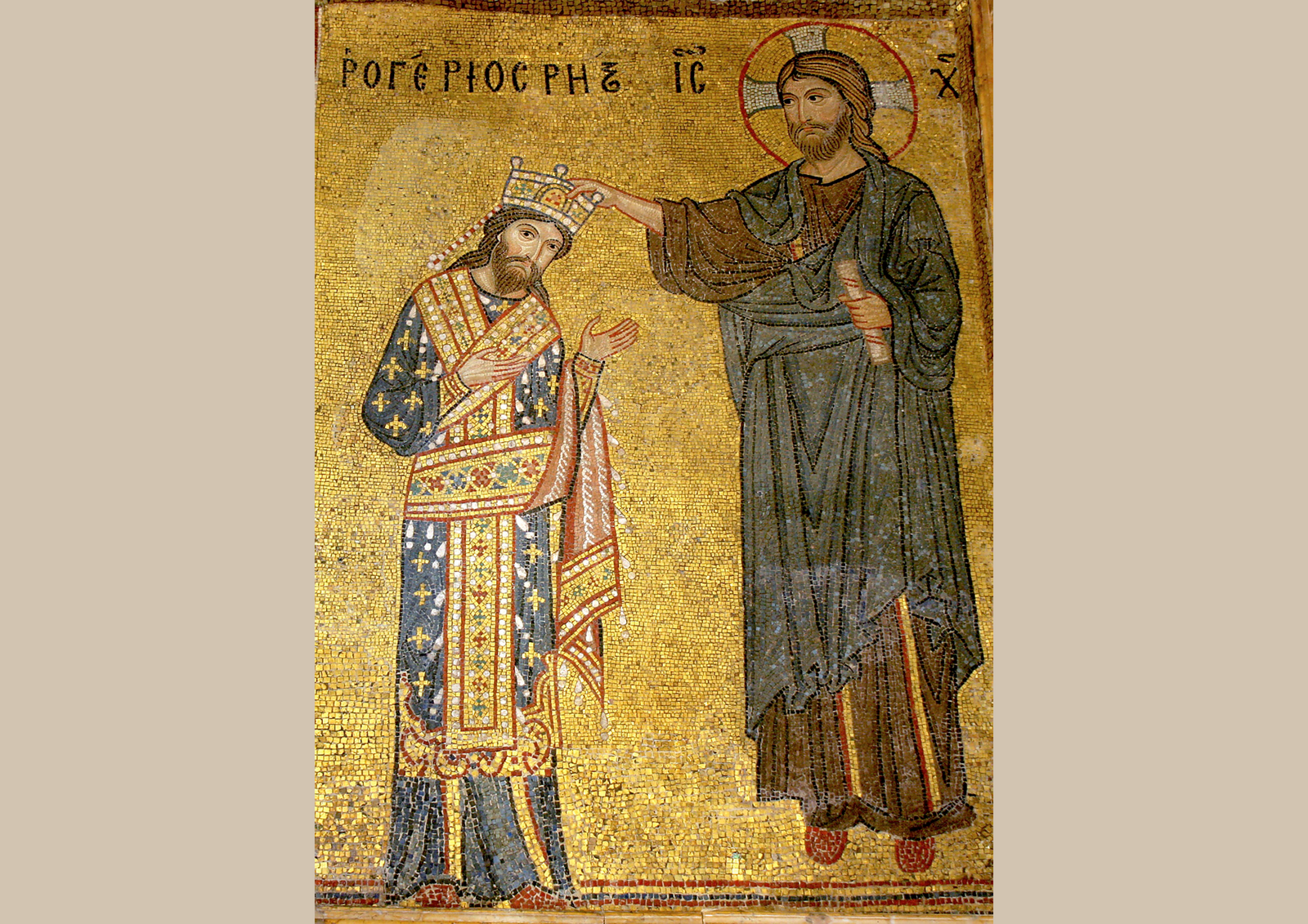 В центре мозаики разворачивается ключевой идеологический акт. Иисус Христос, облаченный в темно-синие и золотые одежды, написанные в строгом византийском стиле, с иератичным, вневременным выражением лика, возлагает корону на голову короля Рожера II. Важно, что Христос не просто благословляет, а именно коронует монарха, что является прямой визуальной метафорой идеи «власти от Бога». Рожер II, в свою очередь, облачен в парадные регалии, понятные латинскому, западному миру. Его поза выражает не раболепие, но достоинство принимающего высшую милость. Эта композиция однозначно возводит норманнского правителя в ранг помазанника Божьего, уравнивая его статус с византийскими василевсами и императорами Священной Римской империи.