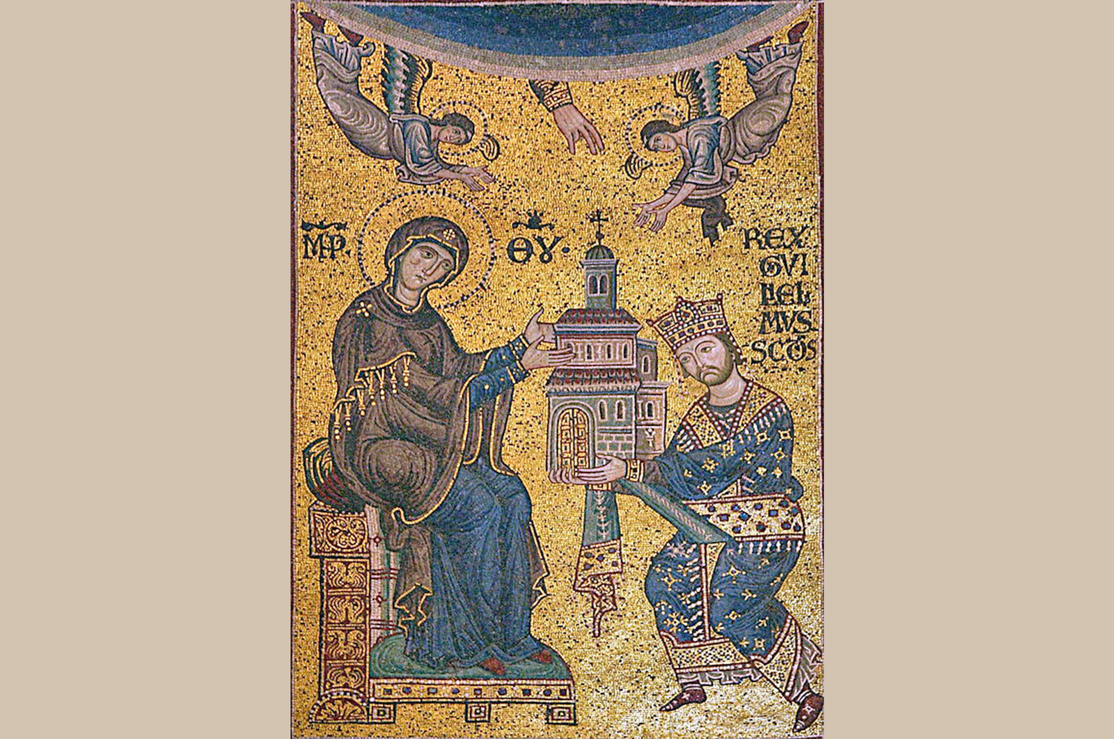 Король Вильгельм II преподносит собор Монреале в дар Богородице. Мозаика из собора Монреале. Сицилия, XII век